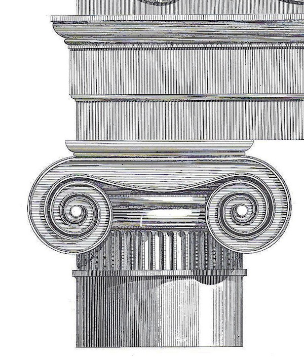 Britons were introduced to the elegance and complexity of Greek moldings with the appearance in 1762 of the first volume of Stuart and Revett’s The Antiquities of Athens. This monumental undertaking, with its numerous engravings of plans, elevations, details, and conjectural restorations, made an indelible impression on the British architectural community and marked the birth of the Greek Revival movement. Pictured in the first volume were several plates pertaining to the Ionic temple on the Ilissus River in Athens.[2] In a detail of the temple’s capital and entablature, the abacus has the profile of a quirked ovolo instead of the straight-sided slab typical of Roman orders. (Figure 6) A quirked ovolo is an ovolo that takes the form of an ellipse and turns inward towards the top, leaving a small space between it and the member above it. Since the curve of an ellipse is complex, requiring several radii to define it, it can take many different profiles from boldly curved to tightly compressed. Another quirked ovolo is seen supporting the taenia.