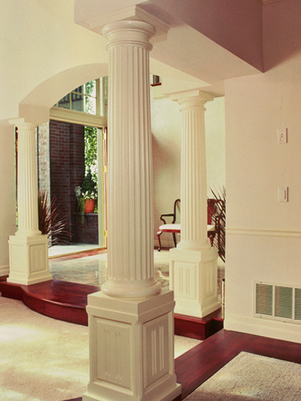 COLUMN DESIGN: Authentic Replication wood. Fluted, round, tapered shafts with Tuscan capitals & Tuscan base moldings / plinths.