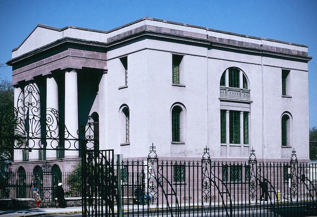 Architect Robert Mills incorporated a Diocletian window in the Meeting Street elevation of the Fireproof Building, constructed 1820-27 as a state office building. (Figure 11) It quickly became known as the Fireproof Building because of its pioneering use of non-combustible materials to protect government records. Though he was a dedicated classicist, Mills used the Diocletian motif in only a few instances. His mentor, Thomas Jefferson, interestingly, applied the motif to none his buildings. In the Fireproof Building, Mills tied the window into a composition embracing the three-part window below. Accenting it is a decorative iron railing, giving a lightness to an otherwise visually solid structure.