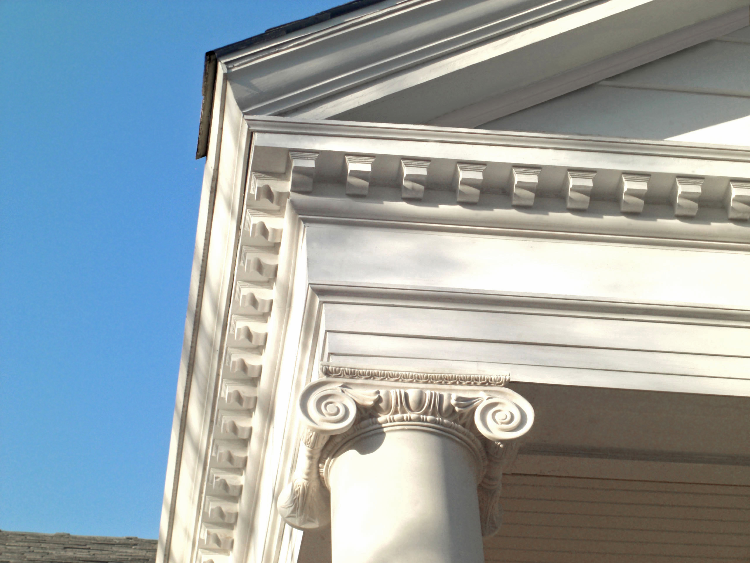 Consulting with Chadsworth, the architects chose a Scamozzi column capital, which was nearly an exact replica of the severely damaged originals at the main entrance.  Like much of the house, which had been neglected for many decades, the original capitals ultimately proved to be held together by 115 years of paint.  The capitals are a key feature of a strongly symmetrical façade, and the architects were grateful to remain true to the original design intent.  Brown & Von Beren Architects were very active in New Haven, and this house represents a late and rare example of very strict Georgian revival done in the East Rock neighborhood.  The original house owner, Moritz Spier, was a warm-hearted coal merchant known to have carried the accounts of hundreds of families through the many economic downturns of that period.  The house had few owners, and its highly detailed interior woodwork has thankfully remained unpainted.  Because of its large foyer and wide open central staircase, the geometry of the house helped it survive a trend of partitioning large houses into Yale graduate student apartments.  The current owners are pleased to bring this grand structure back to life.